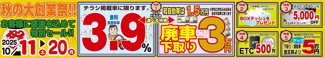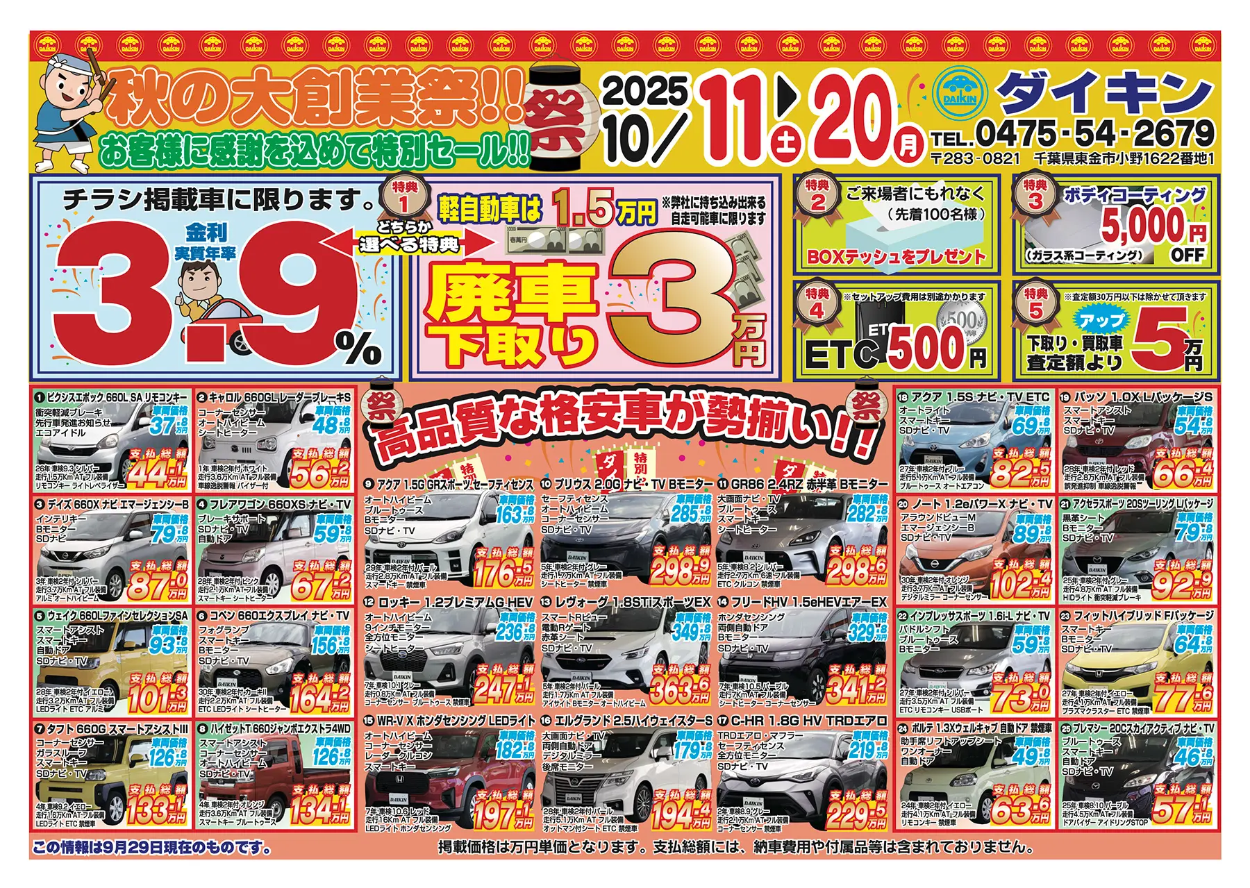 NEWSMore 2025.10.15コスモス満開中!! 2025.10.13頂き物を致しました 2025.10.12味覚の秋まっさかり!! 2025.10.10秋の大創業祭!! 2025.10.09雑草の生きる力に恐れいりました!! 2025.10.08日没前の 2025.10.08H様、お心遣いありがとうございます!! 2025.10.06地方版図柄入りナンバークイズ! 2025.10.01千葉の寺社巡り 2025.10.01そろそろ狙い時?電気自動車もございます! 2025.09.28最高潮!!自民党総裁選挙!! 2025.09.28店内がハロウィン仕様になりました! 2025.09.28お得意様のK様の所作に感激!! 2025.09.26当店がテレ東の番組に映りました!! 2025.09.26鈑金ご入庫のお客様から 2025.09.24神社と季節の花めぐり 2025.09.22S様からのお気遣い😊 2025.09.20いい事があるかも 2025.09.189/23(火・祝)は特別営業を実施します! 2025.09.15展示車両の並べ替えを行いました 2025.09.15会社からハンバーガーが支給されました 2025.09.12オータムセール!! 2025.09.10千葉のお寺・神社廻り・【1】 2025.09.10一龍のキムチ様に車検でご入庫頂きました 2025.09.08石破さん、お疲れ様でした!! 2025.09.08阪神優勝おめでとうございます!! 2025.09.07長いお付き合いのWさんから頂きました 2025.09.06使用期限は今月末まで! 使い忘れてないですか?! 2025.09.06車名の由来 ムーヴキャンバス 篇 2025.09.01嬉しい入庫特典付き!スズキの愛車無料点検実施中! 2025.09.01お取引先様から頂きました 2025.08.30緊急事態に助っ人登場しました!! 2025.08.29あの人気軽SUVの車名の由来 2025.08.27千葉の花だより 2025.08.24結果発表~!! 2025.08.24ごひいきのI様より頂き物をしました 2025.08.23本日ご来店のI様よりこの様なお言葉が・・・・・ 2025.08.23嬉しいお言葉 2025.08.22いよいよ明日⚾ 2025.08.21展示場のメンテナンスが入ります 2025.08.18ご納車のお客様からの声 2025.08.18ご納車のH様から頂きました! 2025.08.17瀨戸さんからのお土産 2025.08.17お盆休みなのでお墓参りに行ってまいりました 2025.08.16本日より営業を再開しました! 2025.08.09ラストサマーセール!! 2025.08.08「車検・点検ラッキーフェア」がはじまりました! 2025.08.03私達の大先輩のSさんからのお土産 2025.08.01台風9号が関東に接近中です 2025.08.01珍しい工事のご紹介!! 2025.07.30当店の工場長からのお土産 2025.07.27和菓子が食べたくなり会社で買いました 2025.07.26O様から頂き物をしました 2025.07.26最後のアジサイ巡りです 2025.07.26社内版土用の丑の日 2025.07.24失礼ながらちょっと前の情報になりますが 2025.07.21熱戦!!千葉県高校野球⚾ 2025.07.21歩道橋の修繕工事 2025.07.20お車をご購入いただいたH様から 2025.07.17緊急追い込み告知!!絶賛セール中!! 2025.07.14ご納車のK様から頂き物をしました 2025.07.11お買得サマーセール!! 2025.07.11夏にかかせない装備品 2025.07.10千葉の花便り 2025.07.107月20日(日)は有権者の日 2025.07.10エンジンオイル交換にお越し頂いたお客様から 2025.07.06美味しいお話 2025.07.05早期発見&早期治療が大切です。 2025.07.04千葉公園のハスを見てきました 2025.07.04N様より頂き物をしました 2025.07.04お取引先様から 2025.06.30緊急告知!ネット購入のタイヤ代理店となりました 2025.06.28お客様のI様より頂き物をしました。 2025.06.27千葉の花便り 2025.06.27ダイキン輪業、、ではありませんが 2025.06.25ダイキンがインスタグラムを始めました! 2025.06.25ジャガイモを頂きました 2025.06.23JFA 第24回全日本O-50サッカー大会のご紹介 2025.06.22会社からの栄養食品の追加 2025.06.21当社の鈑金部門で働いていたSさんから 2025.06.21大阪よりご来店のお客様から 2025.06.20熱中症対策で会社からの支給品がありました!! 2025.06.18潮来のあやめ祭りに行きました 2025.06.18当店は第4弾・東金市がんばるお店応援クーポン券を利用できます 2025.06.18当店の高校サッカーチームへのサポートのご紹介です 2025.06.15私たちの日常の業務 2025.06.15【新入荷!】スイフトスポーツ ZC33S Final Edition 2025.06.13🎊感謝を込めて特別セール!!🎊 2025.06.11小さくなっちゃった?! 2025.06.09ダイキンで今一番安い車とは? 2025.06.09今日はスイーツを頂きました 2025.06.08新旧ハスラー揃ってます! 2025.06.08季節の花紹介 2025.06.07不正改造防止キャンペーン 2025.06.07展示車総入れ替えを実施しました! 2025.06.02新商品を仕入れました 2025.05.30梅雨入りに向けて、視界は良好ですか? 2025.05.29気になるお車のお問い合わせはLINEからでも可能です! 2025.05.28気になるお車の車内を360°カメラの画像で確認いただけます! 2025.05.24走る秘密基地スペーシアベースをご紹介します 2025.05.21気持ちのいい風を体感できる特別なコペンがございます! 2025.05.18衣替えをいたしました 2025.05.16緊急追加告知!! 2025.05.09🎊特別大感謝セール🎊 2025.05.07ゴールデンウイークはいかがお過ごしでしたでしょうか? 2025.05.07畑で採れたての新鮮な玉ねぎを頂きました! 2025.04.29プチクイズなんの苗木? 2025.04.29本日!絶賛営業中!! 2025.04.28憧れのクルマに少しだけ手が届きやすいのが中古車のいいところ 2025.04.27自宅近くの風物詩 2025.04.27ワッフルを頂きました 2025.04.27近くのキンカンも大豊作中 2025.04.27工場のご紹介 2025.04.27この季節の旬な食べ物の収穫です 2025.04.26本日の電光表示板 2025.04.21