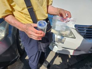 という事で当店で新しいお車を購入頂き、クラウンは当店で引取りさせて頂いたのですが、誠に几帳面なK様は最後に長年お世話になったクラウンへのお別れをきちんとしたいとの事で、御散供(塩・お米・お酒を混ぜたもの)をご用意し、クラウンを清められていました。