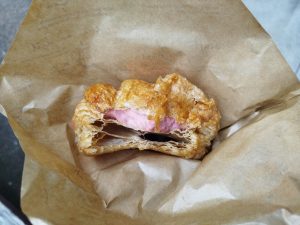 シュークリームはイチゴ味で、生のイチゴと生クリームを混ぜわせたクリーム仕立ての中身は、イチゴの酸っぱみを感じた後にくる甘さが大人の味を思わせます。